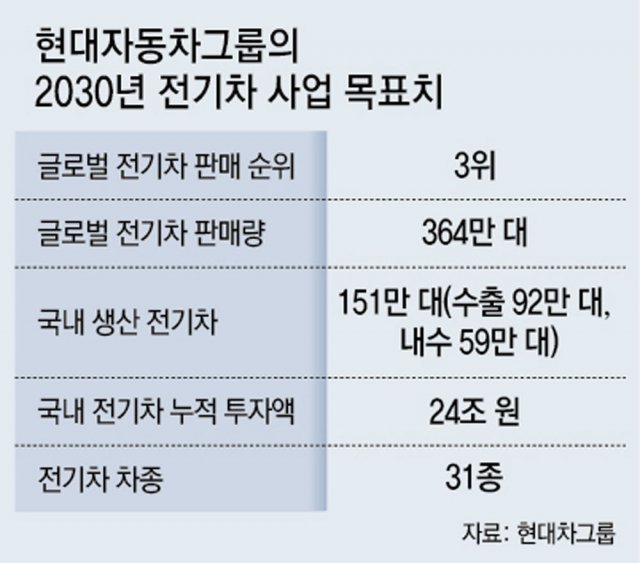 현대차와 기아는 2030년에 전 세계 시장에서 순수 전기차만 각각 185만 대, 179만 대를 판매하겠다는 목표를 세웠다. 현대차그룹의 지난해 전체 자동차 판매량은 684만5000여 대로 글로벌 3위에 올랐다. 이 중 전기차는 37만 대로 세계 7위였다. 2030년에는 전기차 부문에서도 3위로 올라서겠다는 것이다.