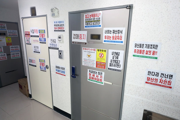 인천시 미추홀구 한 아파트 현관문에 전세사기 피해 수사 대상 주택임을 알리는 안내문이 부착돼 있다. 2023.4.17/뉴스1