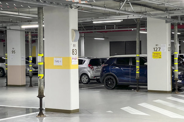 1일 경기 남양주시 별내동 한 아파트 지하주차장에 잭서포트(하중분산 지지대)가 설치돼 있다. 국토교통부는 지난 31일 한국토지주택공사(LH)가 발주한 무량판 구조 아파트 91개 단지 중 철근이 누락된 15개 아파트 단지를 공개했다. 국토교통부 조사 결과 이 아파트는 무량판 방식 기둥 302개 중 126개에서 철근이 누락된 것으로 드러났다. 2023.8.1. 뉴스1