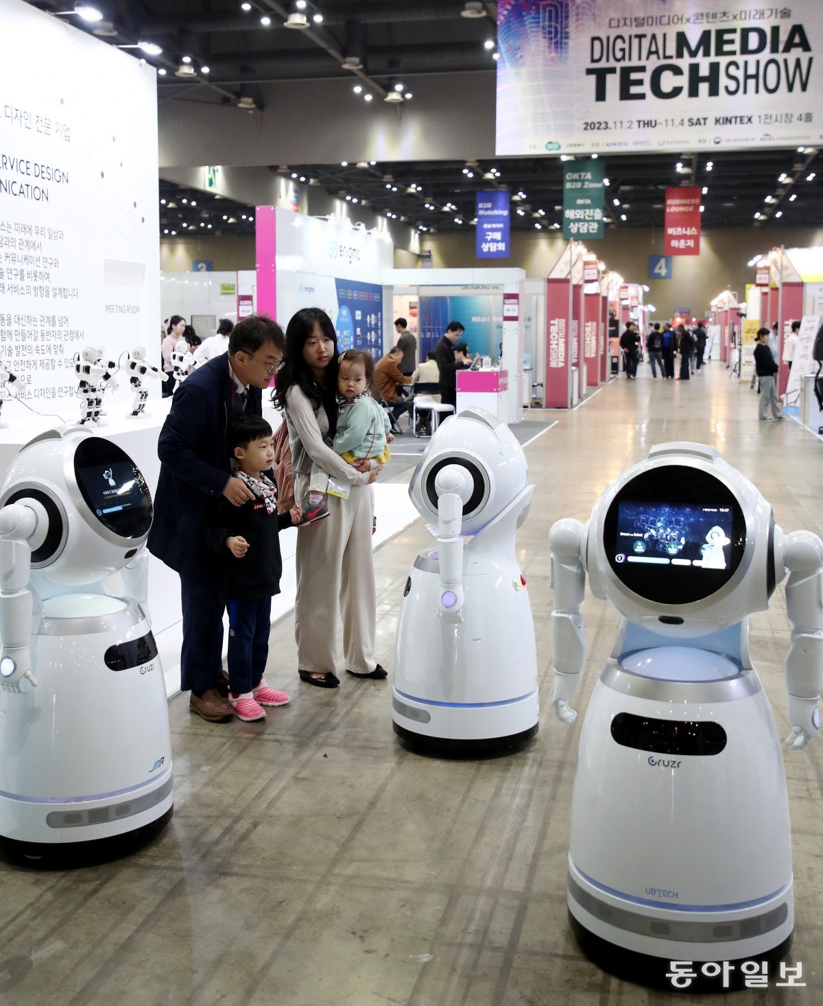 2일 경기 고양시 킨텍스 제1전시장에서 첨단기술이 제안하는 미래 라이프스타일 체험을 주제로 ‘2023 디지털미디어 테크쇼·디지털 퓨처쇼’가 열렸다. 한 가족이 제이엠로보틱스 부스를 방문해 인공지능(AI) 안내 로봇인 ‘크루저’를 체험해 보고 있다.
