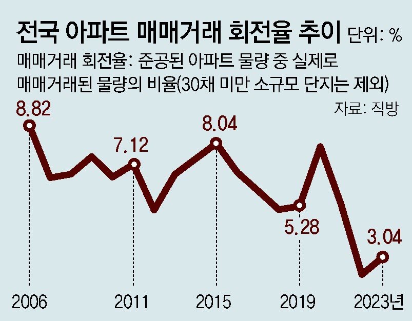 4일 부동산 정보업체 직방에 따르면 올해 전국 아파트 매매 거래 회전율은 3.04%(지난달 22일 발표 자료 기준)를 나타냈다. 이는 실거래 신고가 도입된 2006년 이후 2번째로 낮은 수준이다. 아파트 거래 회전율은 준공 후 아파트(30채 미만 단지 제외) 재고 대비 실제 매매 거래량의 비율을 의미한다. 수치가 낮아지는 건 그만큼 거래 빈도가 줄어드는 것을 의미한다.