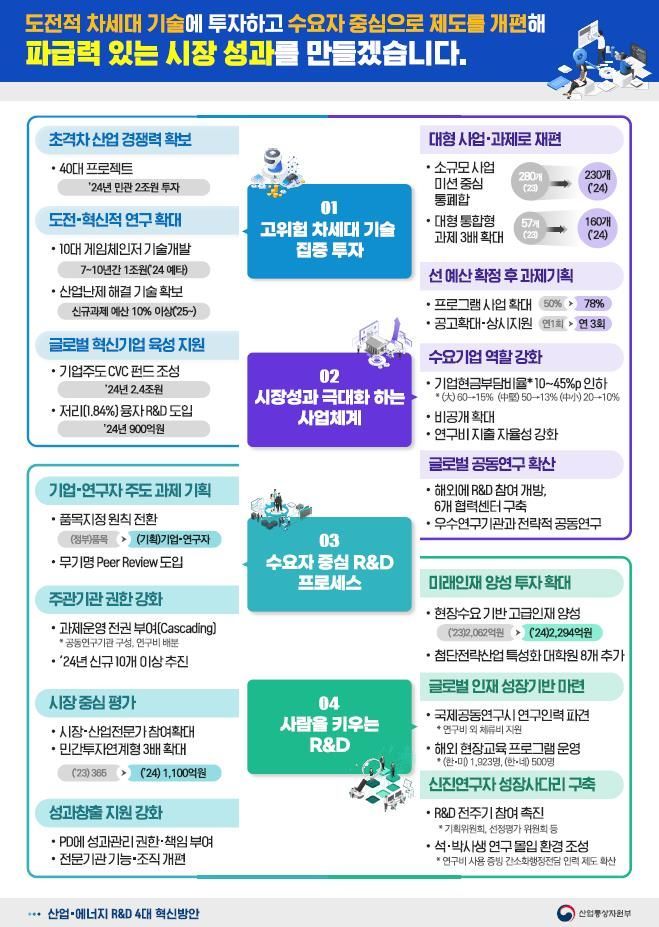 우수한 기업과 연구자가 연구를 주도하고 성과를 낼 수 있도록, 정부 등 공급자 중심에서 수요자 중심으로 R&D 프로세스 대대적으로 개편한다.