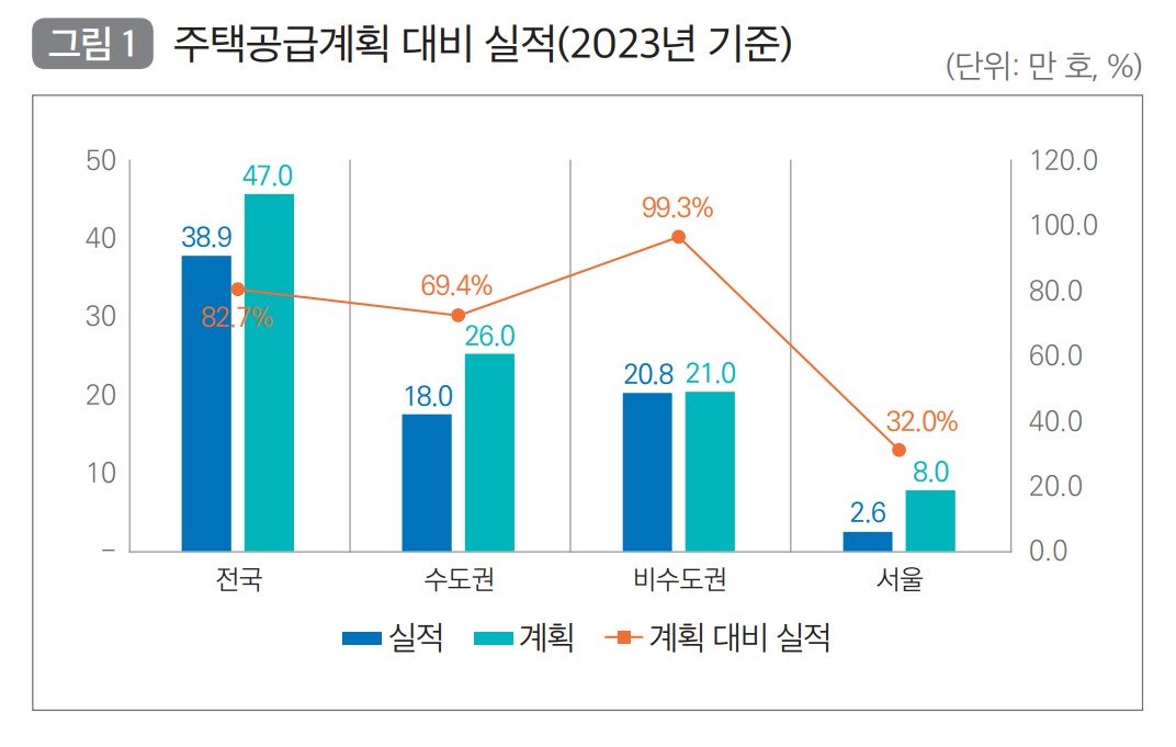 또 2023년 공급계획 대비 실적(인허가)의 경우 전국은 82.7%, 서울은 32.0% 수준으로 매우 저조했다.