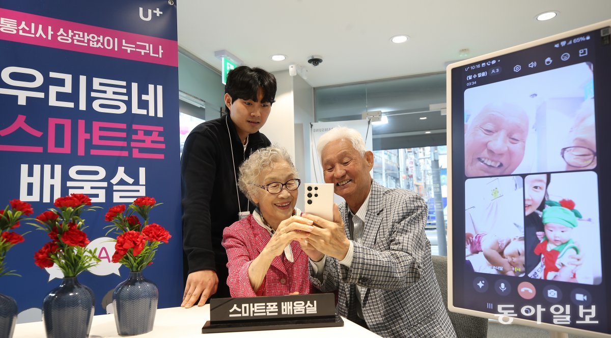 7일 LG유플러스의 ‘스마트폰 배움실’을 찾은 고객이 그룹 영상통화 기능을 사용해 대화를 하고 있다. 스마트폰 배움실은 어버이날을 맞아 노년층 고객들이 스마트폰의 각종 기능을 쉽게 사용할 수 있도록 돕고 있다.