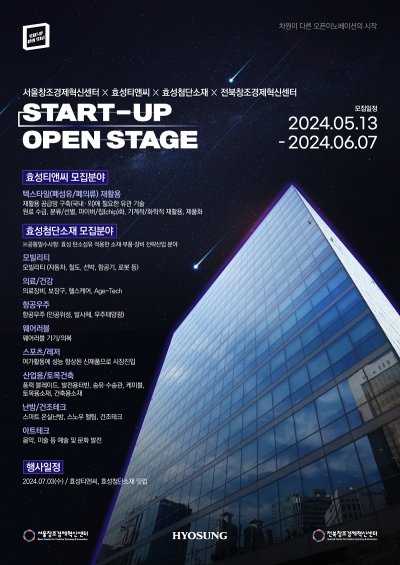 서울창조경제혁신센터(센터장 이영근)가 전북창조경제혁신센터(센터장 강영재)와 함께 ‘2024년 스타트업 오픈스테이지’를 통해 효성티앤씨, 효성첨단소재와 협업할 유망 스타트업을 모집한다고 밝혔다.