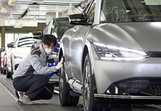 경기 화성에 위치한 기아 공장 ‘오토랜드 화성’에서 근로자가 완성된 전기차 ‘EV6’를 검수하는 모습. (기아제공·사진은 기사 내용과 무관함).