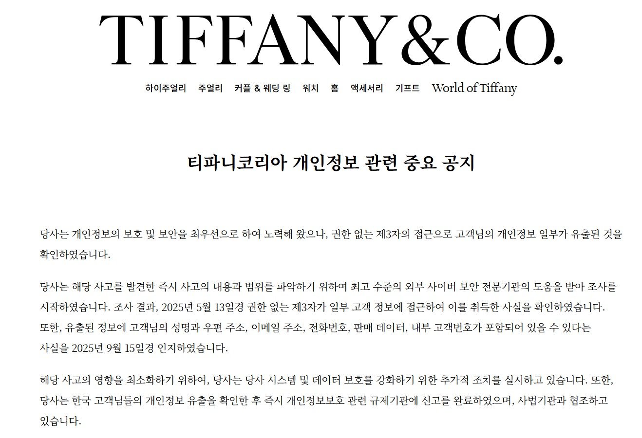 티파니코리아 측은 “5월 13일경 권한 없는 제3자가 일부 고객 정보에 접근해 이를 취득한 사실을 확인했다”며 “유출된 정보에 고객 성명, 우편 주소, e메일 주소, 전화번호, 판매 데이터, 내부 고객번호가 포함됐을 수 있다는 사실을 이날(9월 15일) 인지했다”고 밝혔다.