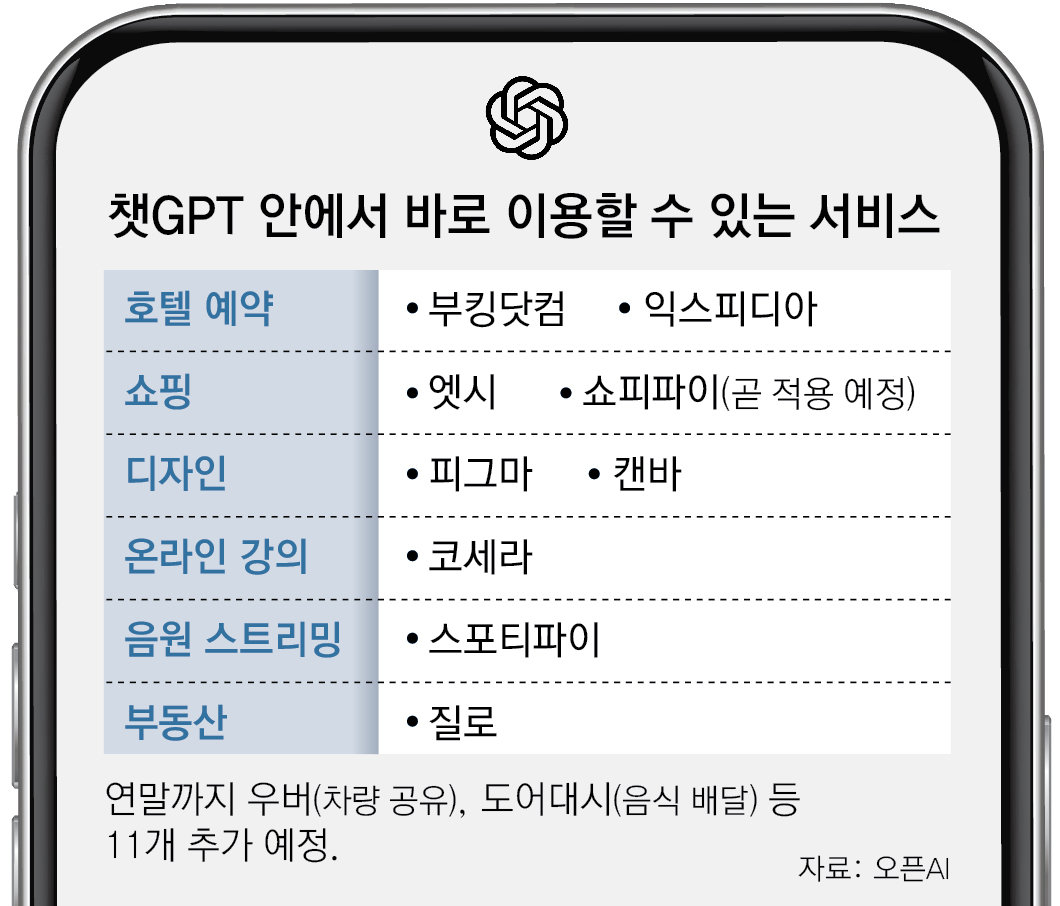 오픈AI는 연말까지 △우버(차량 공유 서비스) △도어대시(음식 배달) △오픈테이블(식당 예약) △타깃(쇼핑) △트립어드바이저(여행 플랫폼) 등 11개 서비스를 추가로 연동할 예정이라고 밝혔다.