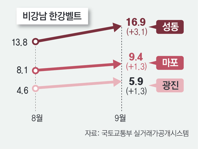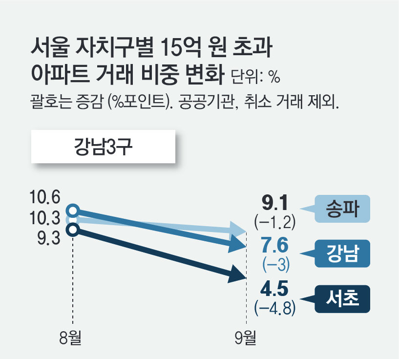 이런 현상은 규제 지역이 아닌 비강남 한강벨트 지역에서 집중적으로 나타났다. 9월 15억 원 초과 아파트 거래 비중은 성동구가 16.9%로 전달(13.8%)보다 3.1%포인트 올랐다. 마포구는 9.4%로 전달보다 1.3%포인트 올랐다. 반면 강남·서초·송파 등 강남 3구는 전달보다 모두 감소했다.