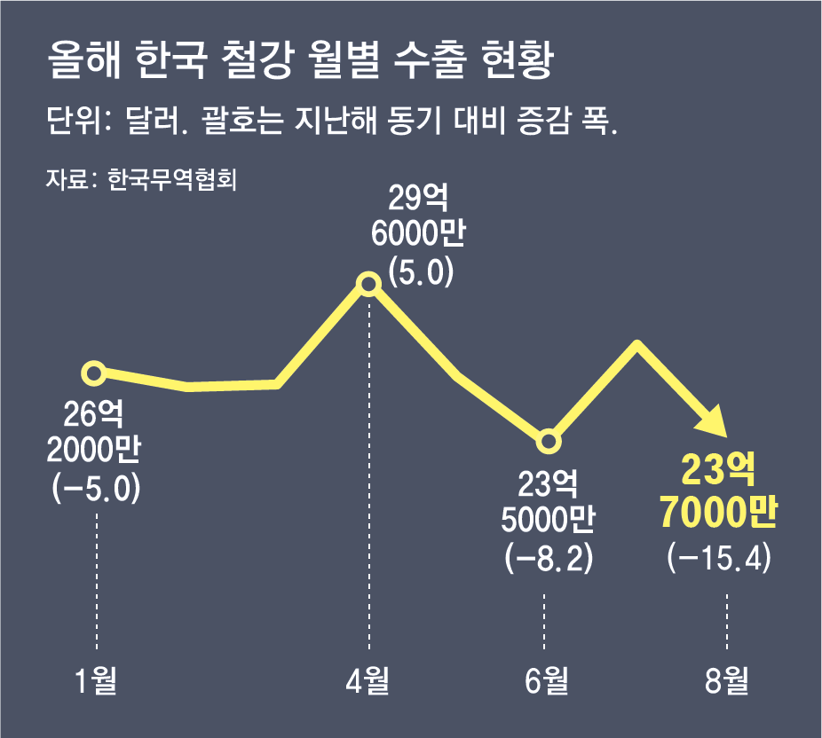 여기에 미국이 3월 철강 제품에 대한 상호관세 25%를 부과하기 시작하고 8월에 이 관세율을 50%로 올리면서 ‘두 번째 비명’이 터져 나왔다. 중국의 저가 공세에 대응하기 위해 수출품 가격을 최대한 억누르는 전략을 쓰면서 올해 1∼8월 수출 물량은 1989만 t으로 지난해 대비 2.3% 증가했는데, 수출 금액은 207억 달러로 같은 기간 대비 6.8% 감소한 것이다. 미국 철강 관세율이 50%로 오른 8월에는 전년 대비 한국산 철강 수출 감소 폭이 15.4%에 달하며 올해 중 가장 컸다. 미국의 철강 관세 적용 첫 달인 3월과 5월, 관세가 50%로 오른 8월의 수출 감소 폭이 10% 이상으로 특히 컸다.