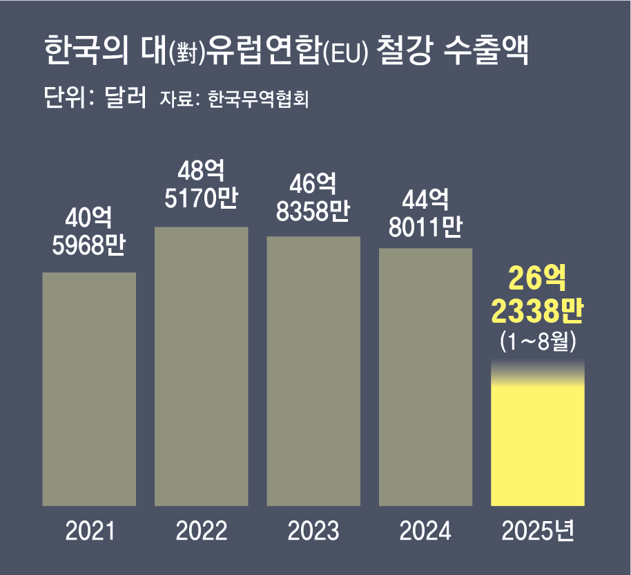 철강은 한국의 전체 수출 물품 중 7번째로 규모가 큰 상품이다. 지난해 기준 수출액 규모는 333억 달러로 힌국 전체 수출(6836억 달러)의 4.9%를 담당했다. 이 중 EU와 미국으로 수출되는 규모가 가장 크다. 지난해 EU로 44억8000만 달러(약 6조3000억 원), 미국으로 43억4700만 달러(약 6조1750억 원)어치의 철강 제품이 수출됐다.