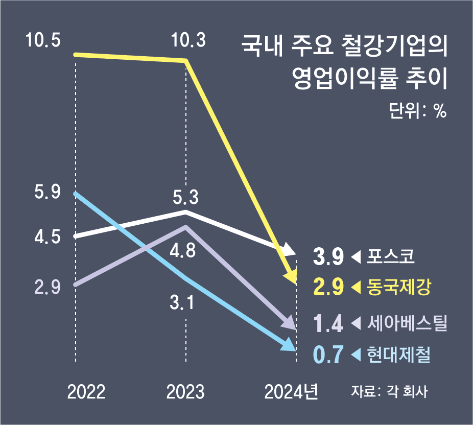 수출 환경이 악화하면서 국내 철강업계의 실적도 곤두박질치고 있다. 지난해 포스코 영업이익률은 2023년 대비 1.4%포인트 감소한 3.9%였다. 같은 기간 현대제철과 세아베스틸 등의 영업이익률도 1% 안팎으로 주저앉으며 철강업계에선 “창사 이래 최대 위기”라는 말이 나온다. 한 철강업계 관계자는 “최대 수출 시장인 EU까지 고율 관세를 부과할 경우 적자 전환이 우려되는 상황”이라고 전했다.