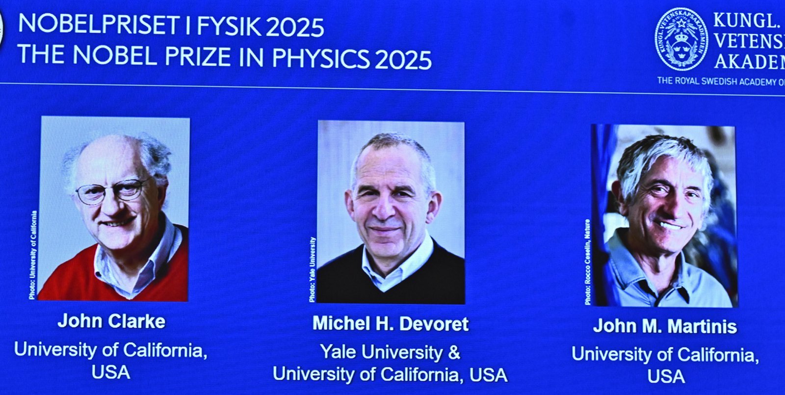 스웨덴 왕립과학원 노벨위원회는 7일(현지 시간) 노벨 물리학상 수상자를 발표했다. 노벨 물리학상은 존 클라크 미국 버클리 캘리포니아대(UC버클리) 교수, 미셸 드보레 미국 예일대 및 샌타바버라 캘리포니아대(UC샌타바버라) 교수, 존 마티니스 UC샌타바버라 교수에게 돌아갔다. 노벨위원회는 “거시적 양자역학적 터널링과 전기회로에서의 에너지 양자화의 발견” 공로를 인정하며 이들에게 노벨 물리학상을 수여했다.