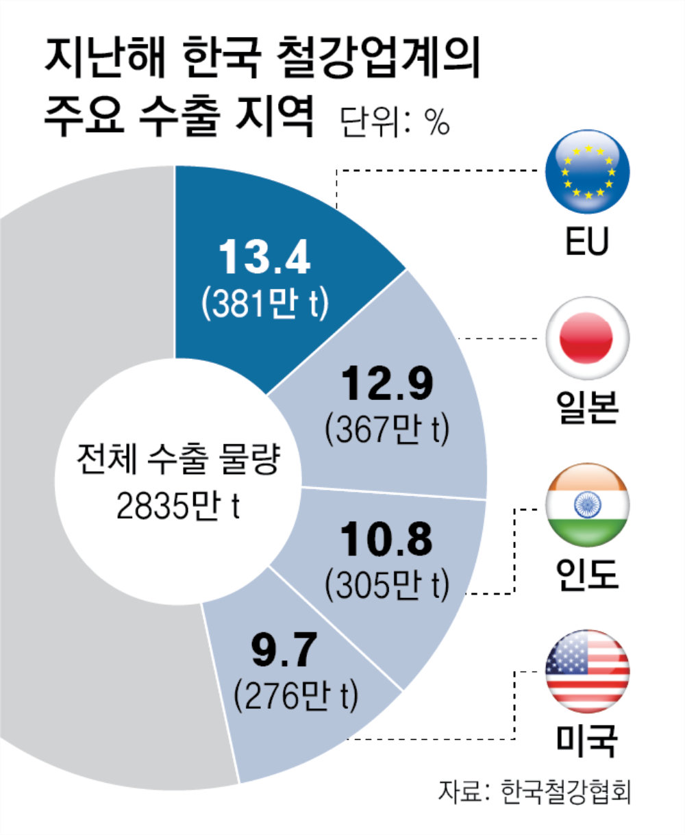 문제는 최대 수출처인 EU에서도 악재가 잇따르고 있다는 점이다. 앞서 7일(현지 시간) EU 집행위원회는 철강 무관세 수입 쿼터를 1830만 t으로 제한하고, 이를 초과하는 물량엔 기존 25%에서 배로 높인 50%의 관세를 부과한다고 발표했다.