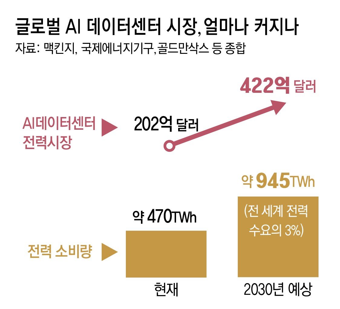 하지만 AI 데이터센터의 전력 수요가 폭증하면서 한국에도 기회가 열리고 있다. 국제에너지기구(IEA)에 따르면 지난해 기준 총 470TWh 수준이었던 데이터센터 전력 수요는 2030년까지 총 945TWh로 두 배가량 폭증할 것으로 예상된다. IEA는 “2030년 전력 수요 예상치는 해당 시점 전 세계 전력 수요의 3%를 차지하는 규모”라고 전망했다. 이에 따라 AI 데이터센터 관련 전체 전력 인프라 시장 규모도 같은 기간 202억 달러(약 28조8000억 원)에서 422억 달러(약 60조2000억 원)로 증가할 것이라는 예측이 나오고 있다.