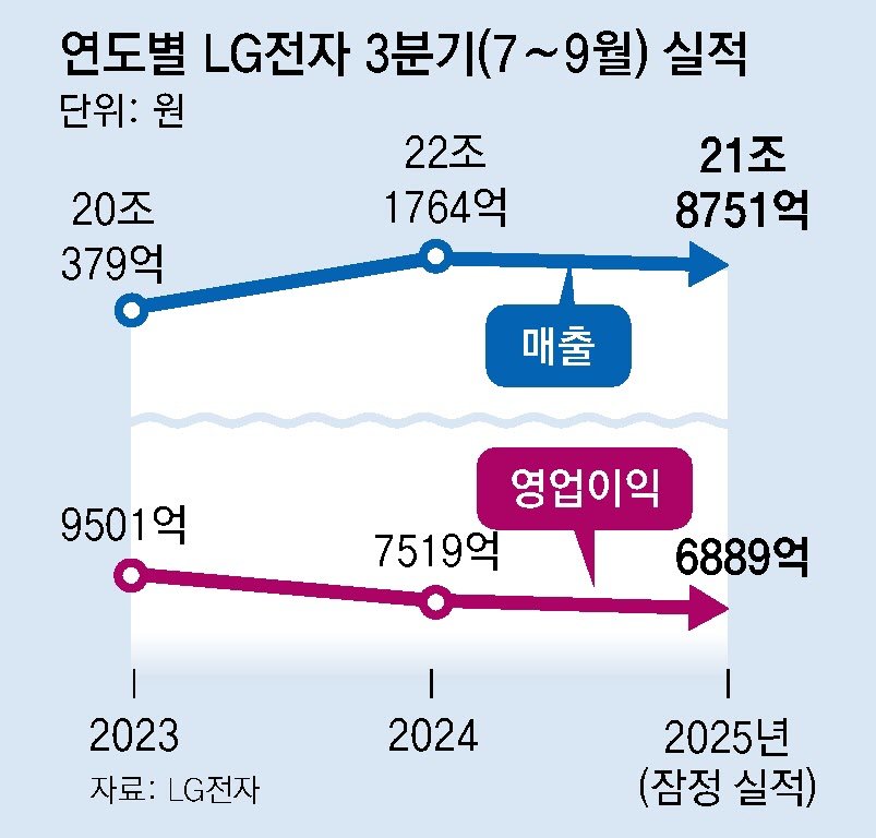 LG전자의 올 3분기(7∼9월) 영업이익이 지난해 같은 기간 대비 8% 넘게 줄었다. 미국발 관세 부과 등 대외 불확실성 속에서 TV사업부 부진이 지난 2분기(4∼6월)에 이어 3분기까지 이어졌다. 다만 생활가전과 자동차 전자장비(전장) 사업에서 선전하면서 시장 전망치보다는 높은 실적을 거뒀다.