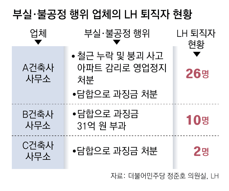 특히 부실 공사에 관련됐거나 담합 등 불공정 행위를 한 업체도 별다른 제재 없이 LH 사업을 수주하고 있었다. A건축사사무소에는 LH 퇴직자 26명이 근무하는데, 모두 부장급 이상으로 부사장·전무·상무 등 임원급만 10명이 넘는다. 이 업체는 인천 검단 아파트 지하 주차장 붕괴 사고, 광주 화정아이파크 붕괴 사고 당시 감리를 담당해 지자체의 영업정지 처분까지 받은 업체다. 철근 누락 사태 당시 LH는 A업체에 입찰 제한 조치를 내렸지만, A업체가 제기한 집행정지 가처분 소송이 인용돼 그 뒤로도 사업 수주가 가능했다.