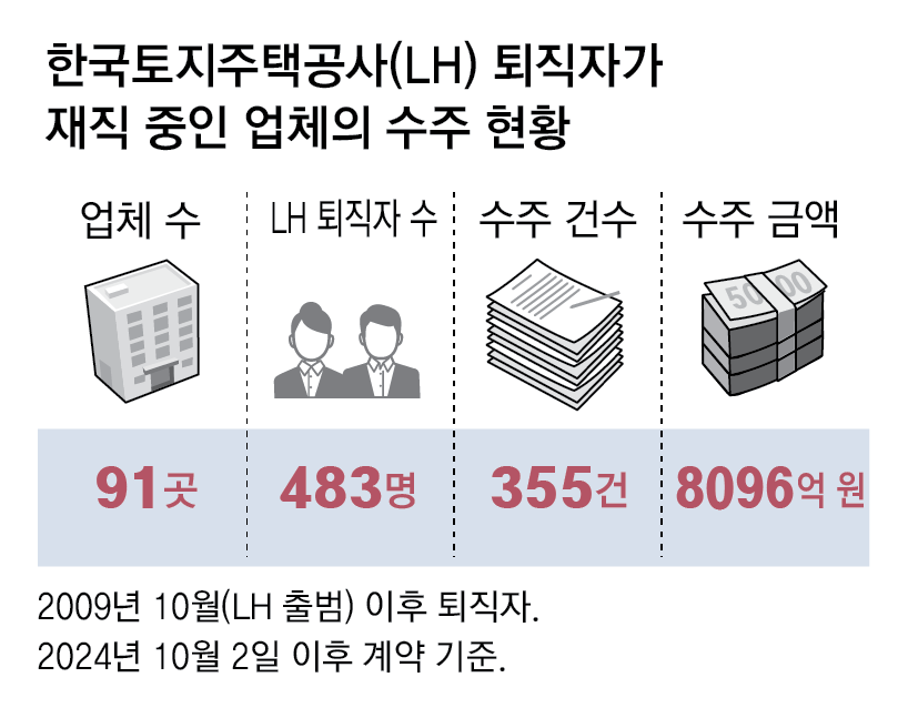 13일 국회 국토교통위원회 소속 더불어민주당 정준호 의원실이 LH로부터 받은 자료에 따르면 2024년 10월 이후 LH 사업을 수주한 업체 중 LH 퇴직자가 근무하는 업체는 91곳으로, 483명이 근무하는 것으로 나타났다. 수주한 사업은 355건, 수주 금액은 8096억 원이었다. LH는 2023년 인천 검단 아파트 주차장 철근 누락 사태 당시 퇴직자 재직 업체가 감리 등을 부실하게 수행했다는 지적이 제기되자 관련 대책으로 지난해 10월 퇴직자 등록 시스템을 구축했다. 업체들의 퇴직자 재직 현황을 파악해 입찰에 불이익을 주기 위해서다.