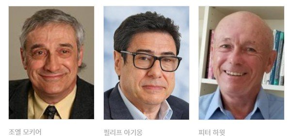 올해 노벨 경제학상은 조엘 모키어 미국 노스웨스턴대 교수(79)와 필리프 아기옹 프랑스 콜레주 드 프랑스 교수(69), 피터 하윗 미국 브라운대 교수(79) 등 3명이 수상했다. 이들은 기술 발전과 지속 가능한 경제 성장의 관계를 연구한 업적을 높이 평가받았다.