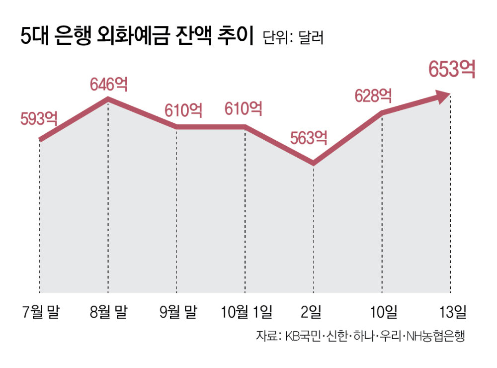 14일 KB국민·신한·하나·우리·NH농협 등 5대 은행에 따르면 13일 기준 달러 예금 잔액은 653억4700만 달러(약 93조5116억 원)로 집계됐다. 추석 연휴 직전인 2일 달러 예금 잔액 563억4200만 달러에 비해 90억500만 달러(16%) 늘어난 것이다. 연휴(3∼9일)가 끝난 10일에는 64억3400만 달러가 순유입됐고, 13일에는 25억7100만 달러가 유입됐다.