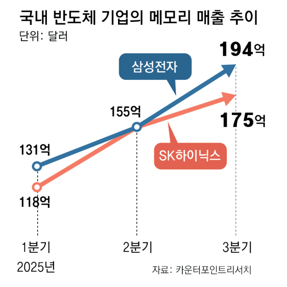 반도체 업계와 증권가는 4분기(10∼12월)에도 메모리 반도체 수요 강세가 이어질 것이라고 보고 있다. 채민숙 한국투자증권 연구원은 “서버용 D램 및 낸드 수요 급증으로 4분기 제품 가격이 각각 두 자릿수 상승률을 보일 전망”이라고 분석했다. 이날 시장조사업체 카운터포인트리서치 자료에 따르면 삼성전자는 올 3분기 전체 메모리 1위 지위를 되찾았다.