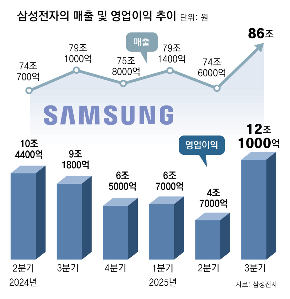 [삼성전자 3년만에 분기 최대 실적] 3분기 영업익 12조 어닝 서프라이즈 반도체 영업익 7조 추정… 전년 2배 서버용 D램-낸드 수요 늘고 가격 급등 발목 잡던 HBM 판매량도 증가세… HBM4-파운드리 경쟁이 향후 관건