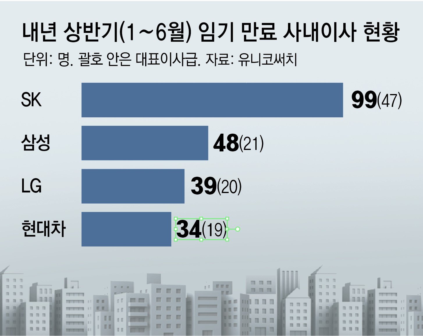 한편 삼성, SK, 현대차, LG 등 4대 그룹에서는 내년 상반기(1∼6월) 중 대표이사급 CEO 약 100명의 임기가 만료된다. 15일 헤드헌팅 업체 유니코써치에 따르면 4개 그룹의 임기 종료 예정 사내이사는 총 220명이며, 이 중 절반 가까운 107명이 대표이사급이다. SK가 99명으로 가장 많고, 삼성(48명), LG(39명), 현대차(34명)가 그 뒤를 잇고 있다.