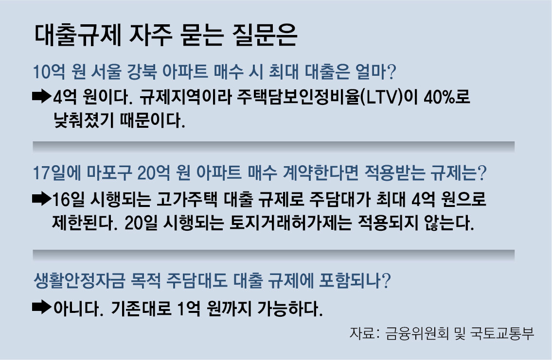 “이주비 대출은 재건축·재개발 사업 영향 등을 감안해 이번 규제 대상이 아니다. 현행과 동일하게 대출 한도가 6억 원이다. 중도금 대출은 6·27 대책 당시 6억 원 대출 한도 규제를 적용하지 않았고 이번 규제에서도 제외됐다.”