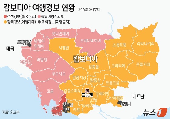 한편 외교부는 16일부터 캄보디아 일부 지역에 대해 여행경보 4단계를 발령하고 여타 지역에 대해서도 기존 여행경보를 상향 조정했다.