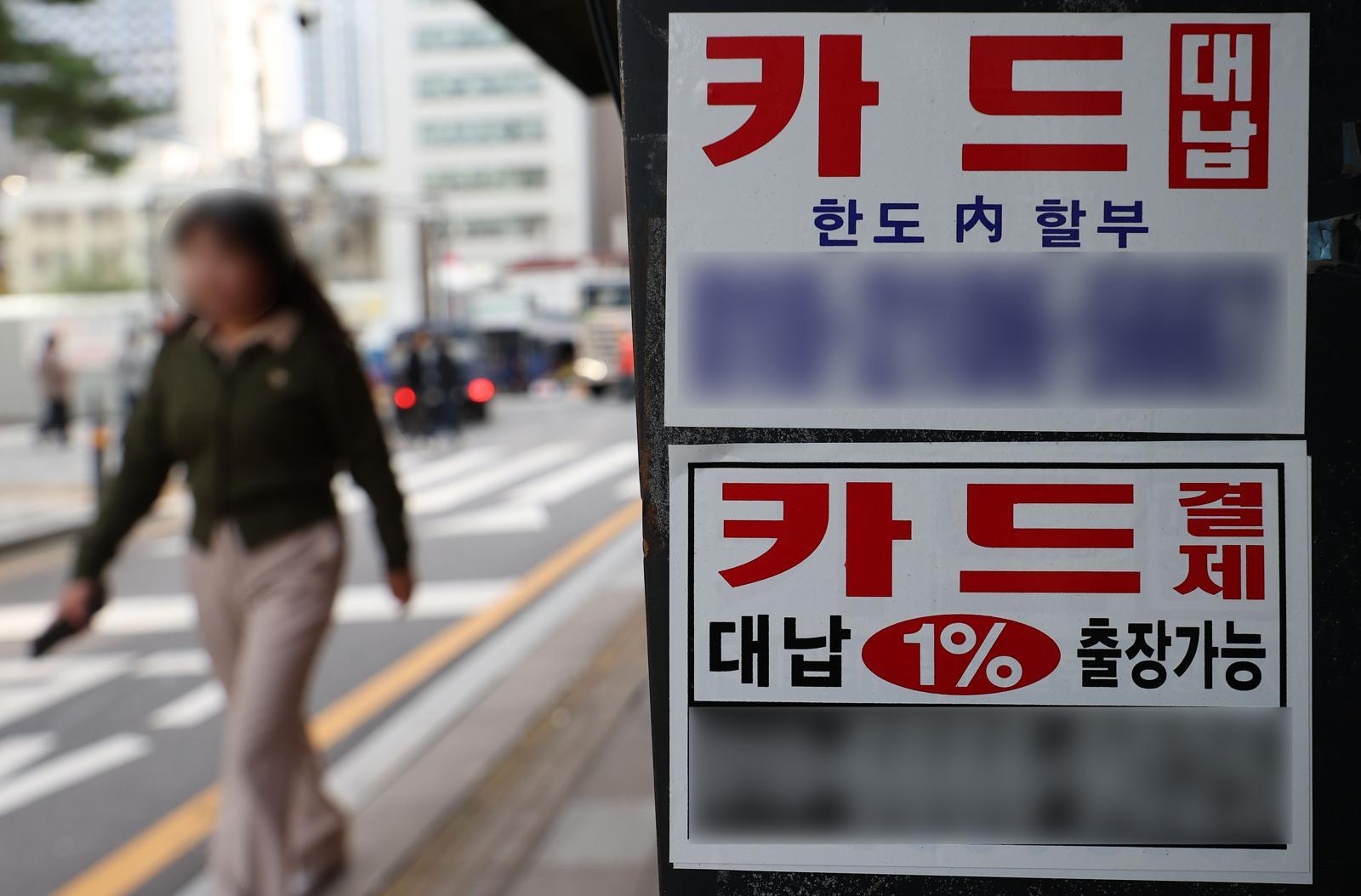 국내 카드 대출 연체 규모가 역대 최대치를 기록했다. 국민의힘 강민국 의원실이 금융감독원으로부터 제출받은 자료에 따르면 지난 8월 말 기준 카드 대출금액은 44조7850억원이며 이중 1개월 이상 연체된 금액은 1조4830억원이다. 이는 2023년 26만5000건 9830억원, 2024년 31만2000건 1조940원보다 급증한 수치다. 20일 서울 도심에 신용카드 대출 광고가 붙어 있다. 2025.10.20. 뉴시스