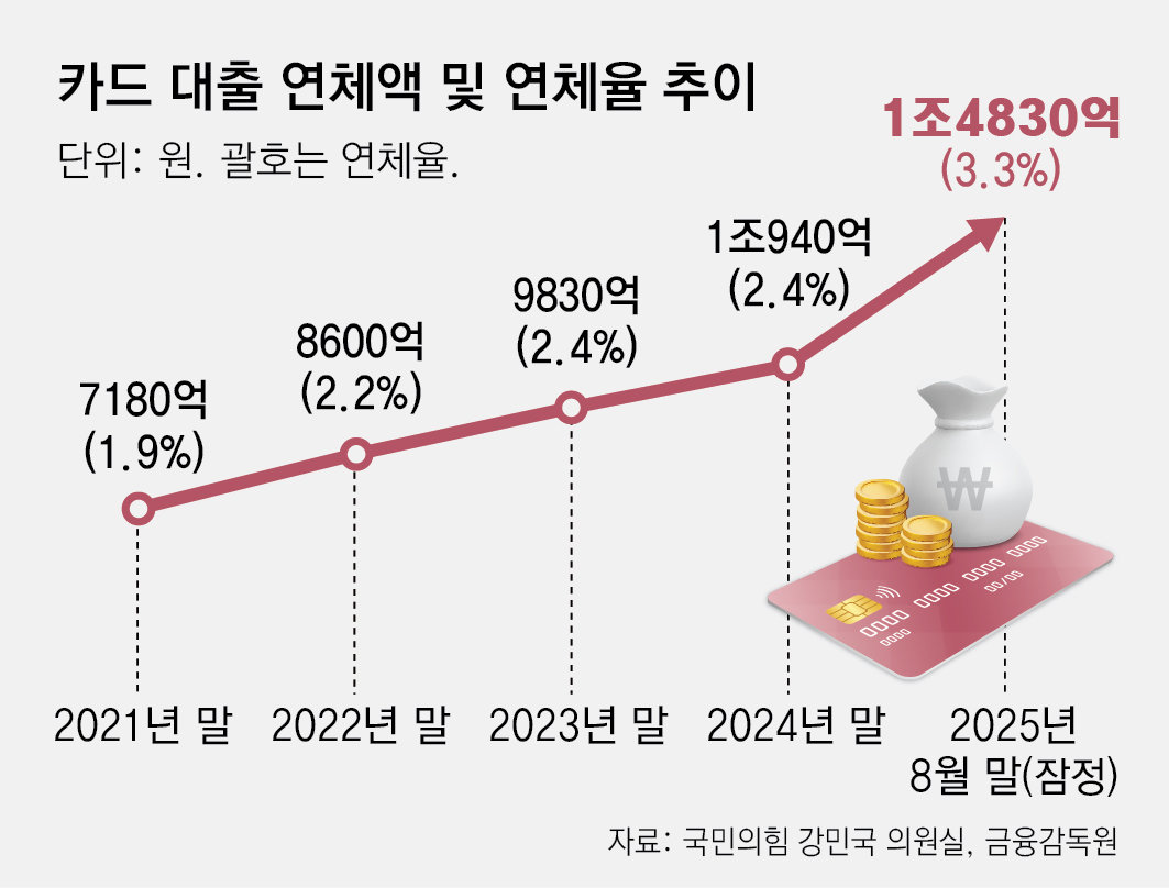 연체 금액이 급격히 늘면서 연체율도 높아지고 있다. 2021년 말 1.9%였던 카드대출 연체율은 2022년 말 2.2%, 2023년과 2024년 말에는 2.4%였다. 이후 올 8월 말에는 3.3%로 뛰었다. 카드업계 관계자는 연체율이 증가한 이유에 대해 “시중은행 등 다른 업권과 마찬가지로 내수 침체와 경기 불황이 원인인 것으로 보인다”고 설명했다.