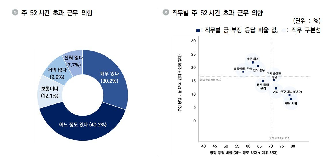 특히 전략·기획(81.2%), 연구·개발(R&D·80.0%) 직무군에서 긍정 응답 비율이 높았다. ‘거의 없다’와 ‘전혀 없다’는 각각 9.9%와 7.7%로 집계됐다.