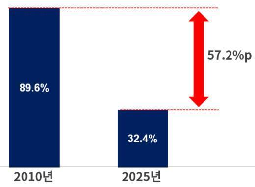대한상공회의소가 지난 2010년과 올해 국내 제조기업을 대상으로 실시한 조사 중 ‘한국이 중국보다 기술 경쟁력이 앞선다’는 응답 비교. 자료제공 = 대한상공회의소