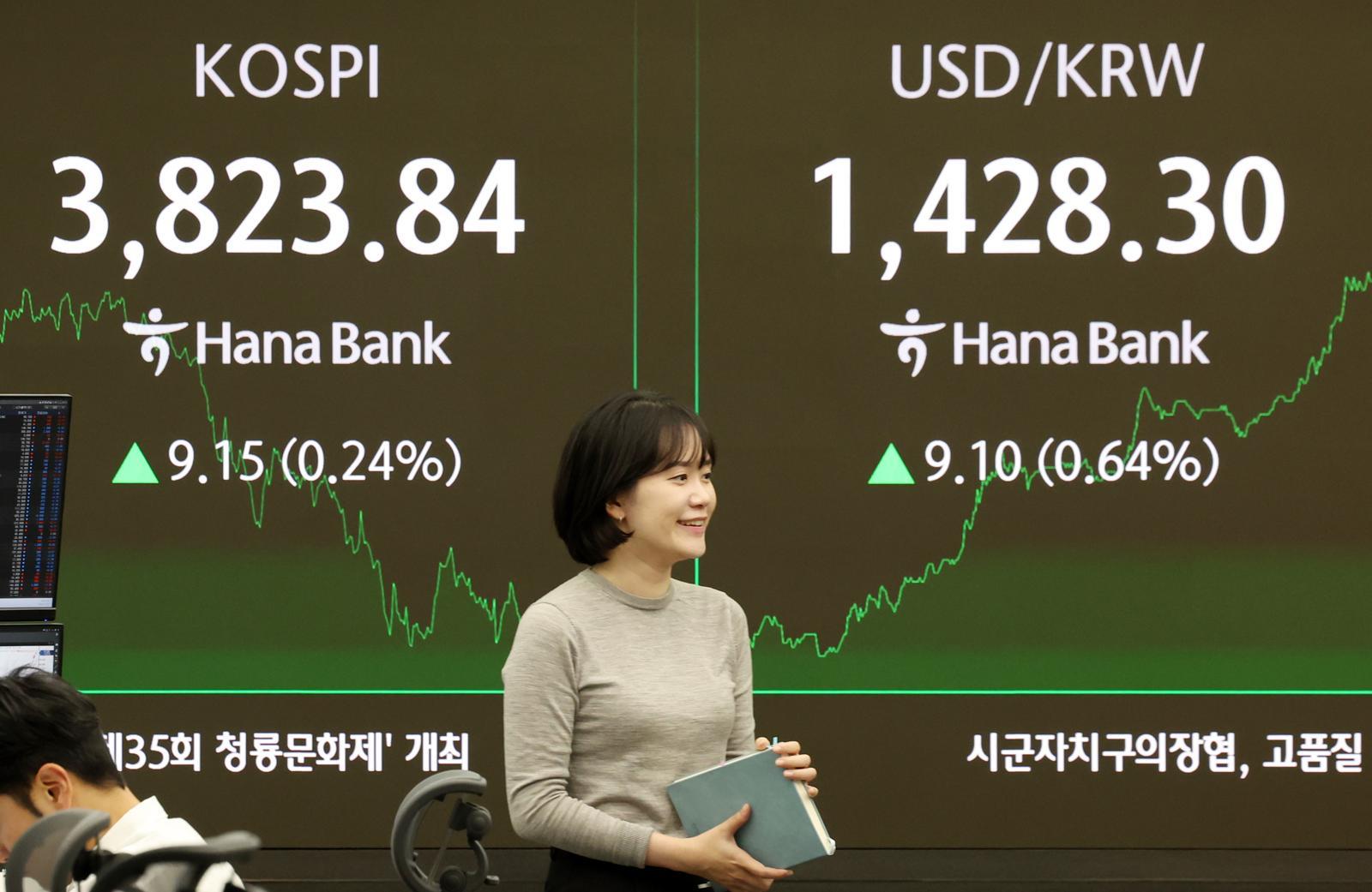 코스피가 전 거래일(3814.69)보다 9.15포인트(0.24%) 상승한 3823.84에 장을 마감한 21일 오후 서울 중구 하나은행 딜링룸 전광판에 지수가 표시되어 있다. 코스닥 지수는 전 거래일(875.77)보다 3.27포인트(0.37%) 내린 872.50, 서울 외환시장에서 원·달러 환율은 전 거래일 주간거래 종가(1419.2원)보다 8.6원 오른 1427.8원에 주간 거래를 마감했다. 2025.10.21. [서울=뉴시스]