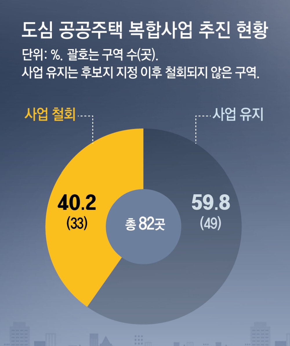 2021년 2월 도입된 공공 주도 도심복합사업도 현재까지 착공한 현장은 없다. 사업 후보지로 선정된 82곳 중 33곳(40.2%)이 철회하며 10곳 중 4곳은 없던 일이 됐다.