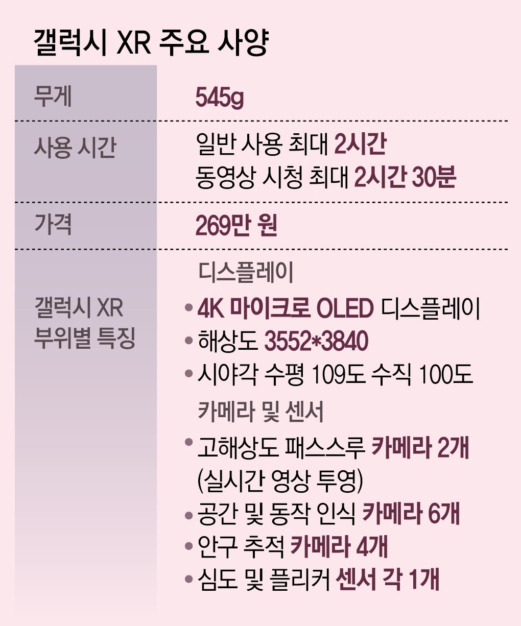 갤럭시 XR 무게는 545g으로 경쟁 제품인 애플 비전프로(약 800g)보다 가볍다. 출고가는 269만 원으로 프리미엄을 내세운 애플 비전프로(3499달러), 보급형을 앞세운 메타 퀘스트(499달러) 사이 가격대다. 일반 사용 시 최대 2시간, 동영상 시청 시 최대 2시간 30분 동안 쓸 수 있다.