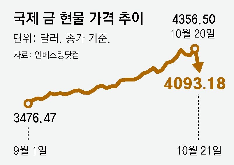 이번 하락을 놓고 일시적 조정이라는 평가가 나온다. 국제 금과 은 현물 가격이 올해 들어 각각 60%, 80%씩 급등하자 단기 차익실현 매물이 많았다는 의미다. 최근 발표된 미국 주요 기업들의 3분기(7∼9월) 실적이 대체로 좋아 안전자산에 대한 선호도가 줄어든 것이 영향을 미쳤을 것으로 보인다. 글로벌 금 시장의 큰손인 인도가 최대 힌두교 축제인 ‘디왈리’를 맞이해 휴장한 것도 금값 하락에 주요하게 작용했다는 분석이 나온다.
