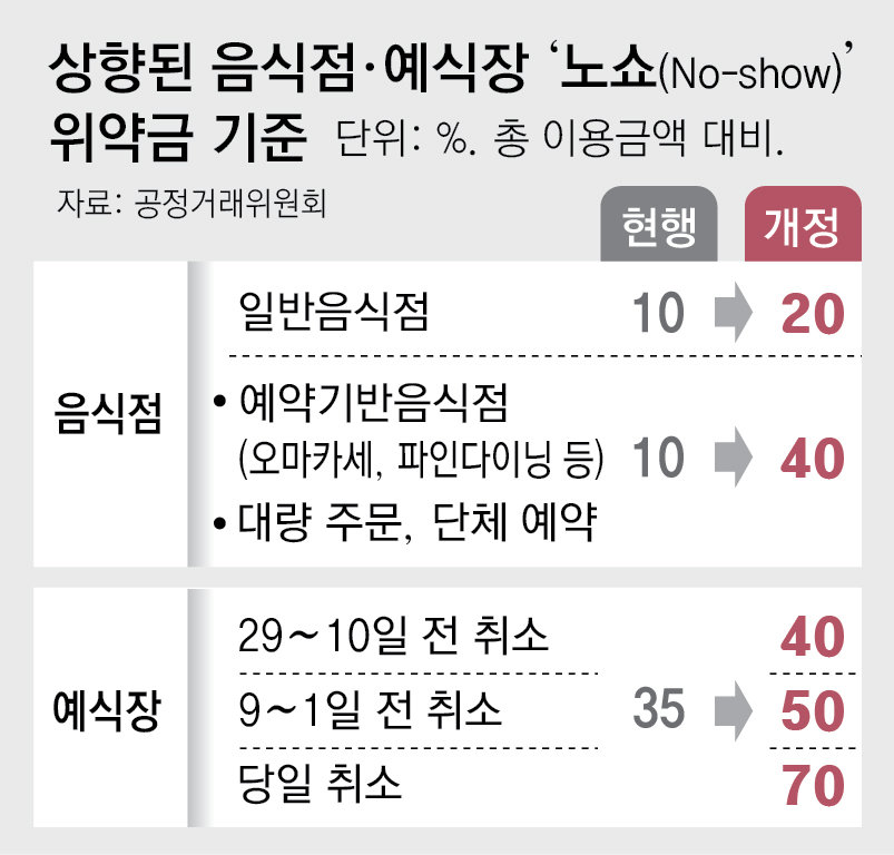 음식점 이용 금액의 10% 수준이었던 ‘노쇼(No-show·예약 부도)’ 위약금이 최대 40%로 대폭 높아진다. 예식 당일에 예식장 계약을 취소할 경우 전체 비용의 70%를 위약금으로 물어내야 한다. 반복되는 노쇼로 인한 소상공인의 피해를 예방하고 소비자와의 분쟁을 사전에 막으려는 취지다.》
