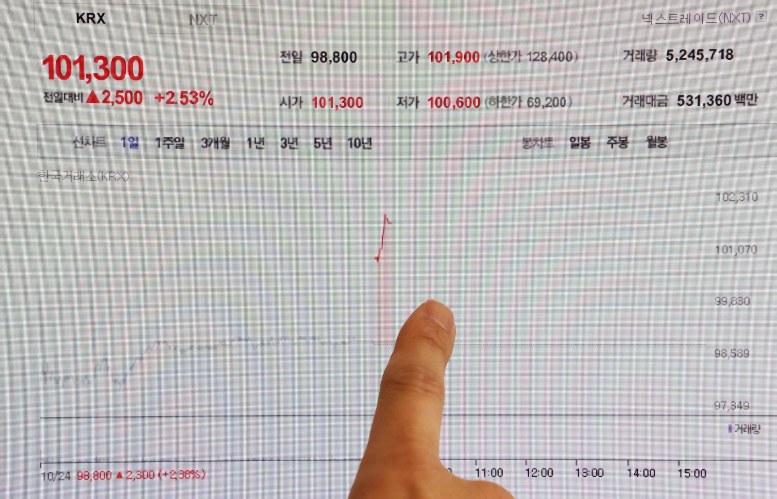 삼성전자 주가가 상장 이후 처음으로 장중 10만원을 돌파한 27일 서울시내에서 한 시민이 컴퓨터 모니터로 삼성전자 주가를 확인하고 있다. 2025.10.27 뉴스1