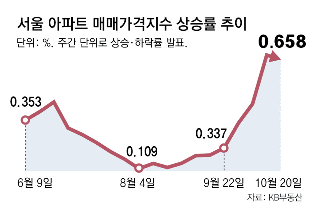 10·15 대책 발표 전후로 서울 아파트 값 주간 상승률은 역대 최고를 찍은 바 있다. 한국부동산원 주간 아파트 가격 동향에 따르면 이달 셋째 주(20일 기준) 서울 아파트 값은 전주(13일 기준·0.54%) 대비 0.50% 올랐다. 전주 상승률은 추석 연휴 기간을 포함한 2주간 누적 상승률로, 1주간 상승세로는 2012년 주간 통계 집계를 시작한 이래 가장 큰 폭이었다.