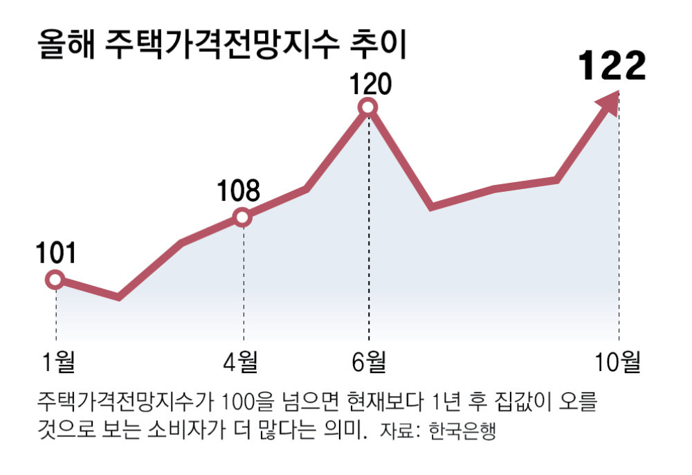 28일 한국은행의 ‘소비자동향조사’ 결과에 따르면 10월 주택가격전망지수는 122로 전월보다 10포인트 상승한 것으로 집계됐다. 이는 문재인 정부 당시 집값이 급등했던 2021년 10월(125) 이후 4년 만에 최고치다. 상승 폭도 2022년 4월 10포인트 이후 가장 컸다. 주택가격전망지수는 1년 후 집값에 대한 기대치를 반영한다. 100보다 높으면 집값 상승을 예상하는 소비자가 하락을 예상하는 소비자보다 더 많다는 의미다.