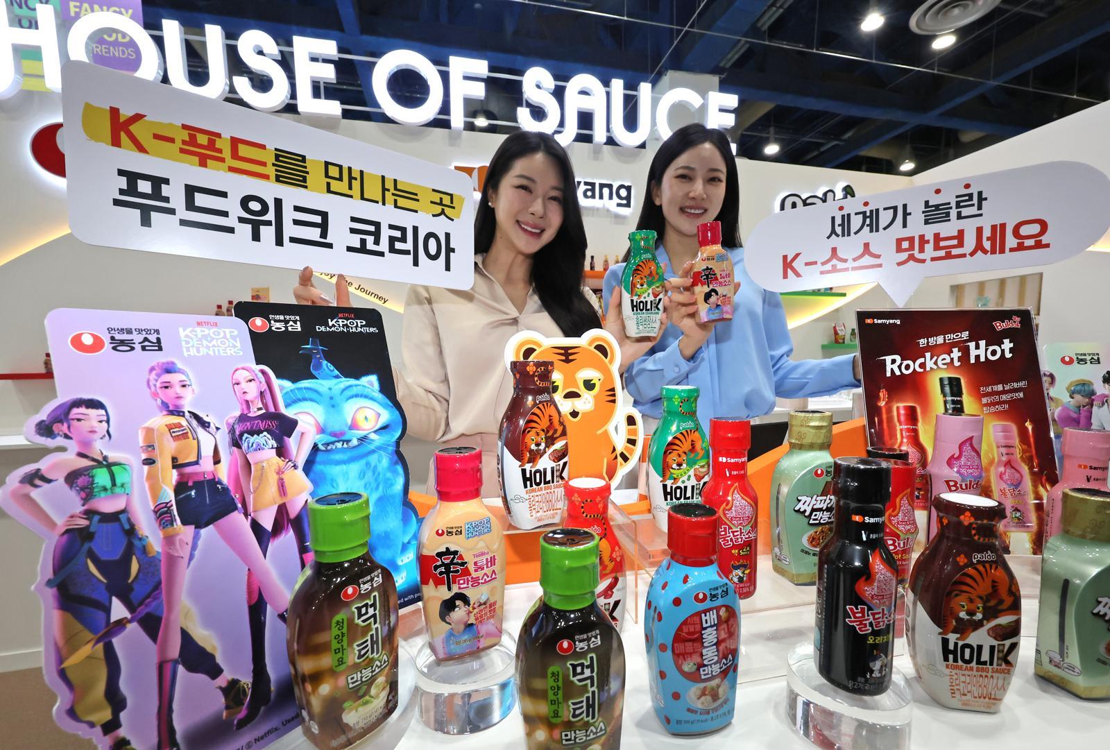 29일 서울 강남구 코엑스에서 열린 ‘푸드위크 코리아 2025’ 행사장에서 모델들이 국내 인기 소스 제품들을 선보이고 있다. 올해로 20회째를 맞이하는 푸드위크 코리아는 식품산업 최신 트렌드를 한자리에 모은 식품 전시회로 42개국 950개 기업이 참가했다.