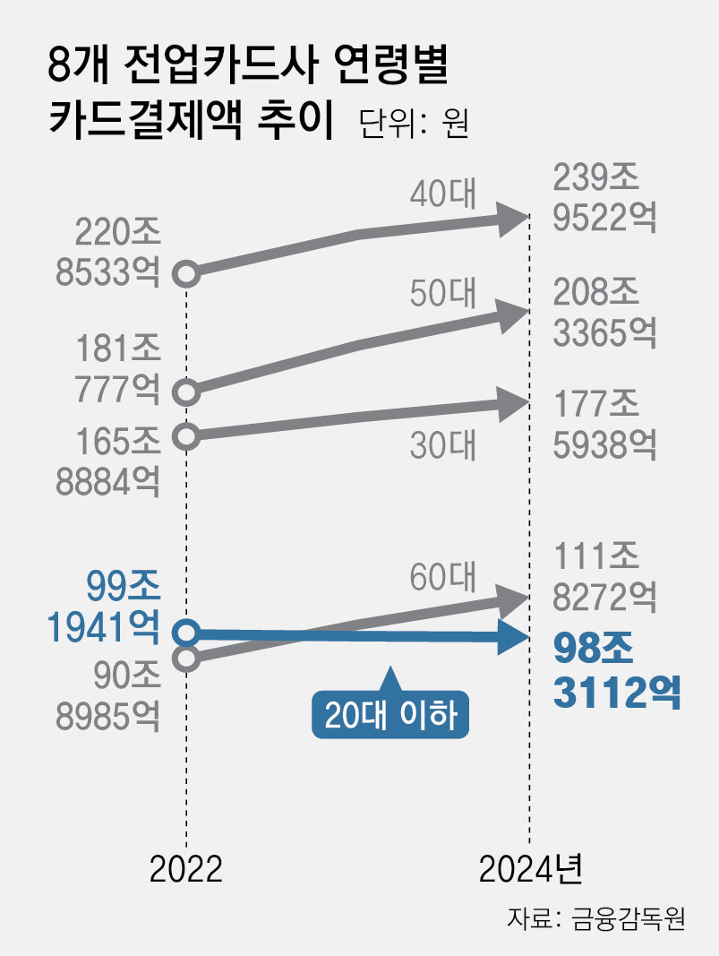 원래 20대 카드 결제액은 2021년 92조5261억 원에서 2022년 99조1941억 원으로 7.2% 증가했다. 하지만 2023년에는 98조6115억 원으로 전년에 비해 0.6% 감소하기 시작했고 2024년에는 전년 대비 0.3% 줄어든 98조3112억 원이었다.