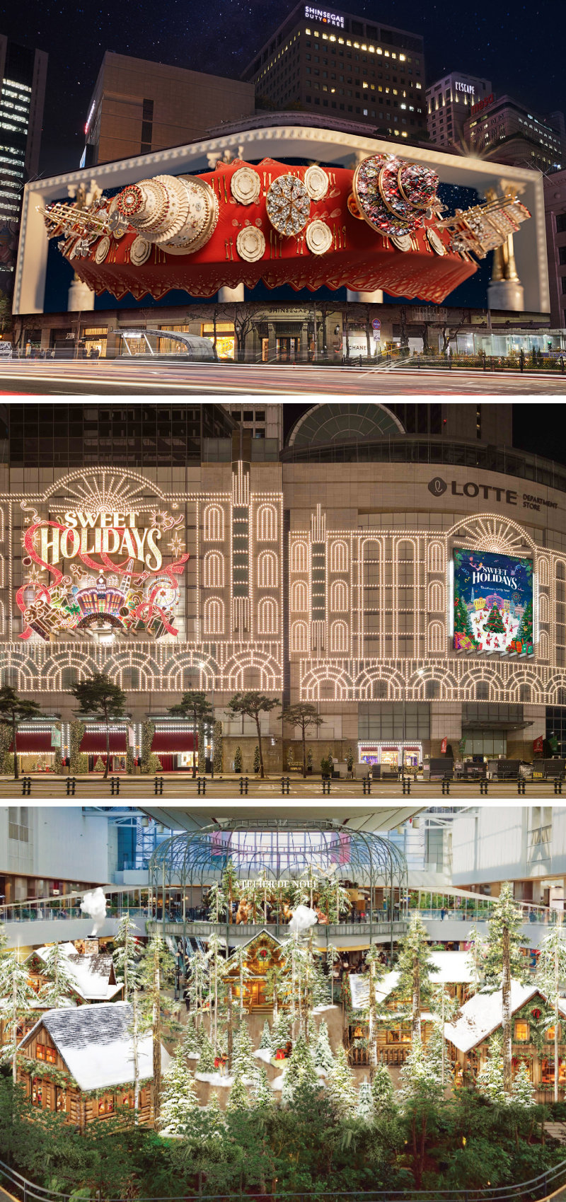신세계백화점 본점 신세계스퀘어에 선보이는 크리스마스 영상(첫 번째 사진)과 롯데백화점 크리스마스 비주얼 테마 ‘스위트 홀리데이’로 물든 롯데타운 명동 전경(가운데 사진), 더 현대 서울에 조성되는 크리스마스 공방 시안. 각 사 제공