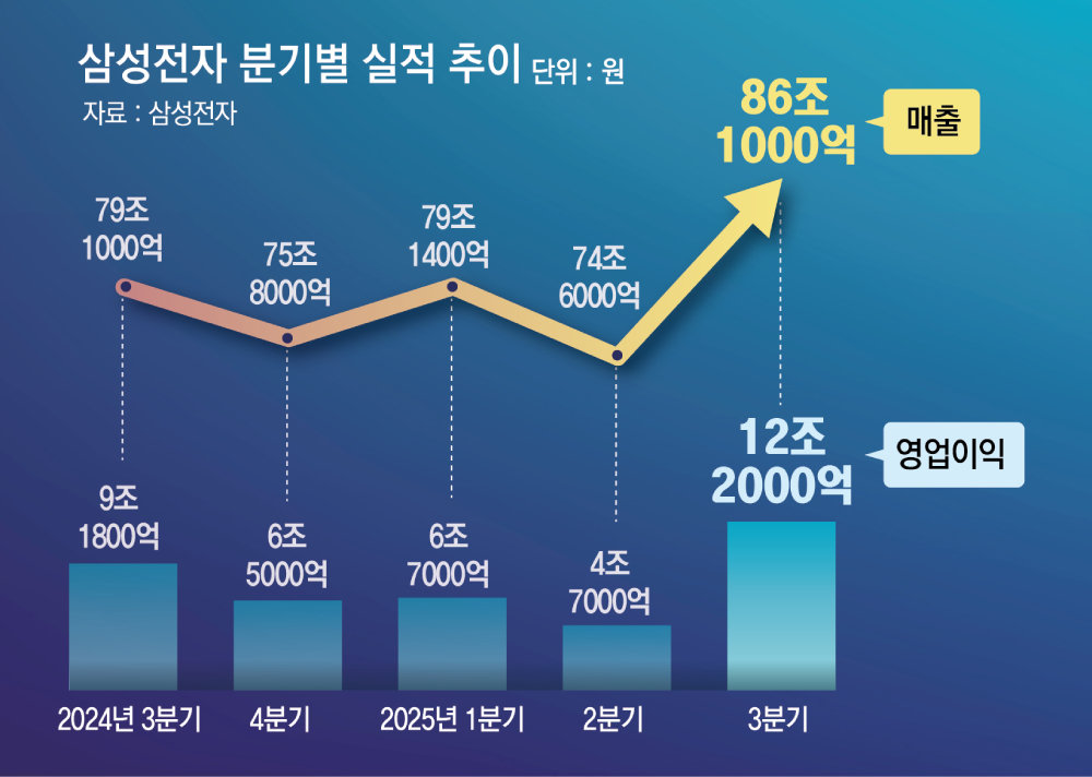 30일 삼성전자는 올해 3분기(7∼9월) 연결기준 매출 86조1000억 원을 달성했다고 공시했다. 분기 기준 사상 최대 매출로, 전년 동기 대비 8.8% 불어났다. 영업이익도 같은 기간 32.5% 늘어난 12조2000억 원을 달성했다. 지난해 2분기(10조4000억 원) 이후 5분기 만에 분기별 영업이익 10조 원을 넘겼다.