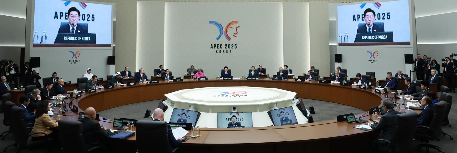 이재명 대통령이 31일 경북 경주화백컨벤션센터(HICO)에서 아시아태평양경제협력체(APEC) 정상회의 첫 세션을 주재하고 있다. APEC 2025 KOREA 제공