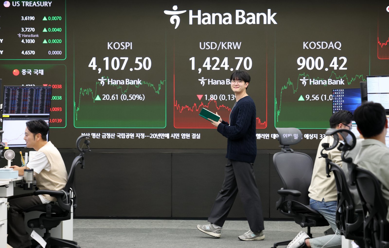 코스피가 전 거래일(4086.89)보다 20.61포인트(0.50%) 오른 4107.50에 마감한 31일 오후 서울 중구 하나은행 딜링룸 전광판에 지수가 표시되어 있다. 코스닥 지수는 전 거래일(890.86)보다 9.56포인트(1.07%) 상승한 900.42, 서울 외환시장에서 원·달러 환율은 전 거래일 주간거래 종가(1426.5원)보다 2.1원 내린 1424.4원에 주간 거래를 마무리했다. 2025.10.31 뉴시스