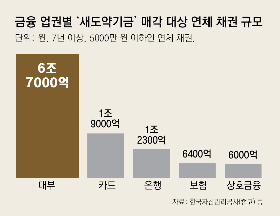 한국자산관리공사(캠코) 등에 따르면 대부업권이 보유한 새도약기금의 매입 채권(7년 이상, 5000만 원 이하) 대상은 약 6조7000억 원으로 전체 금융권 보유액의 절반을 차지한다. 카드(1조9000억 원), 은행(1조2300억 원), 보험(6400억 원), 상호금융(6000억 원) 등 개별 업권들 중 가장 크다.