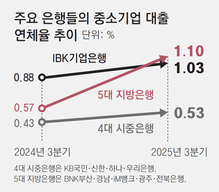 4대 시중은행(KB국민·신한·하나·우리)의 중기 대출 연체율도 올해 3분기 평균 0.53%로, 같은 분기 기준으로 2016년 3분기(0.65%) 이후 9년 만에 최고치다. 내수 부진이 심화되고 있는 지방의 5대 은행(BNK부산·경남·iM뱅크·광주·전북) 연체율은 더 심각하다. 이들의 올 3분기 중기 대출 연체율은 1.1%로 시중은행의 2배가 넘었다.