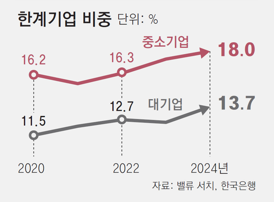 한국은행이 9월 발표한 ‘금융안정 상황’ 보고서에 따르면 지난해 말 기준 전체 외부감사 기업 중에서 이자보상배율이 3년 연속 1을 밑돈 한계기업 비중은 17.1%로, 2010년 이후 최고치였다. 이자보상배율이 1을 밑돌았다는 것은 한 해 벌어들인 돈으로 대출 이자조차 갚지 못했다는 뜻이다. 이 중에서도 중소기업의 한계기업 비중은 지난해 18.0%로 전체 평균보다 높았다.